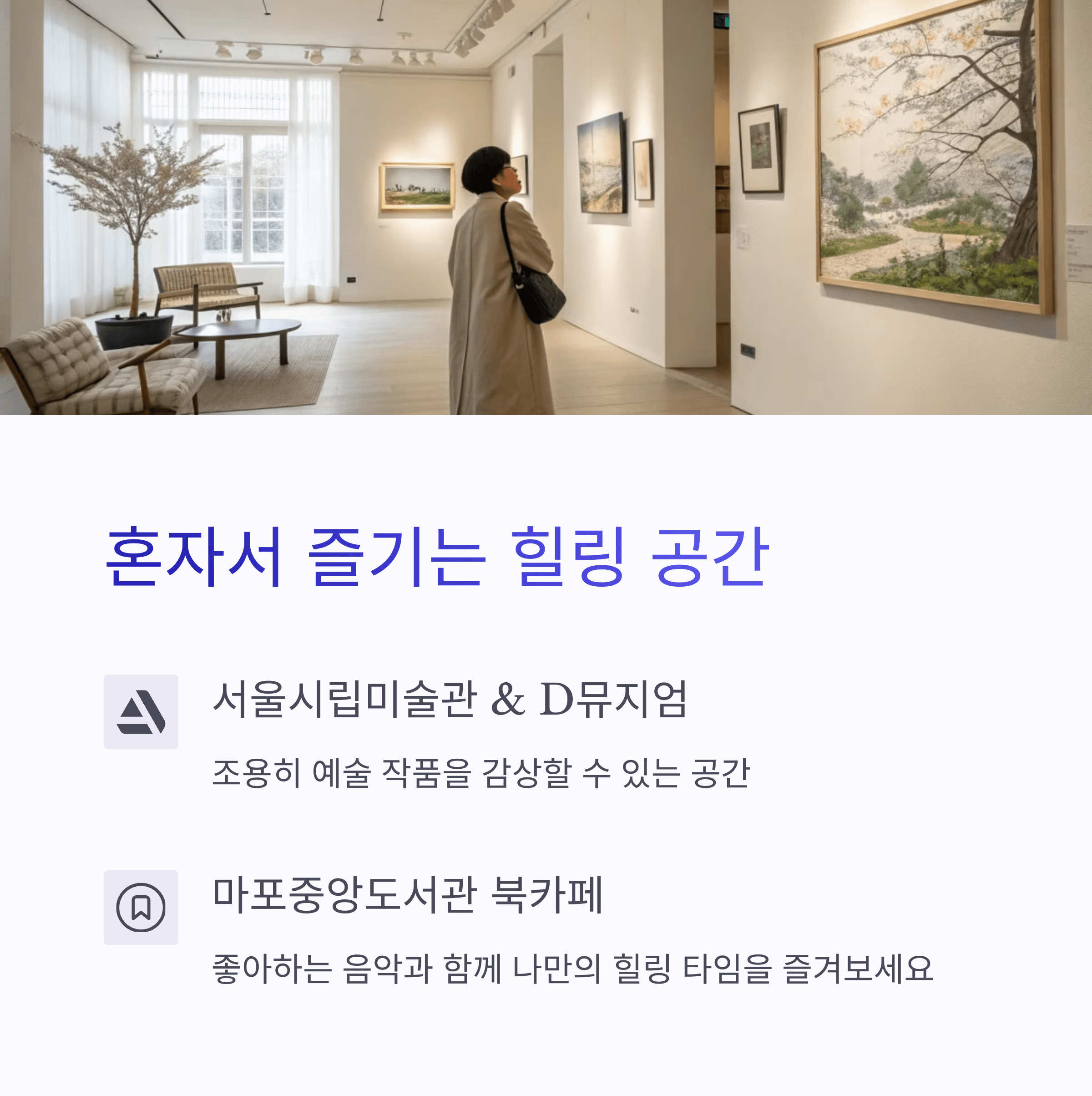 A. 미술관, 북카페, 공방 클래스는 혼자만의 힐링 타임에 제격입니다.