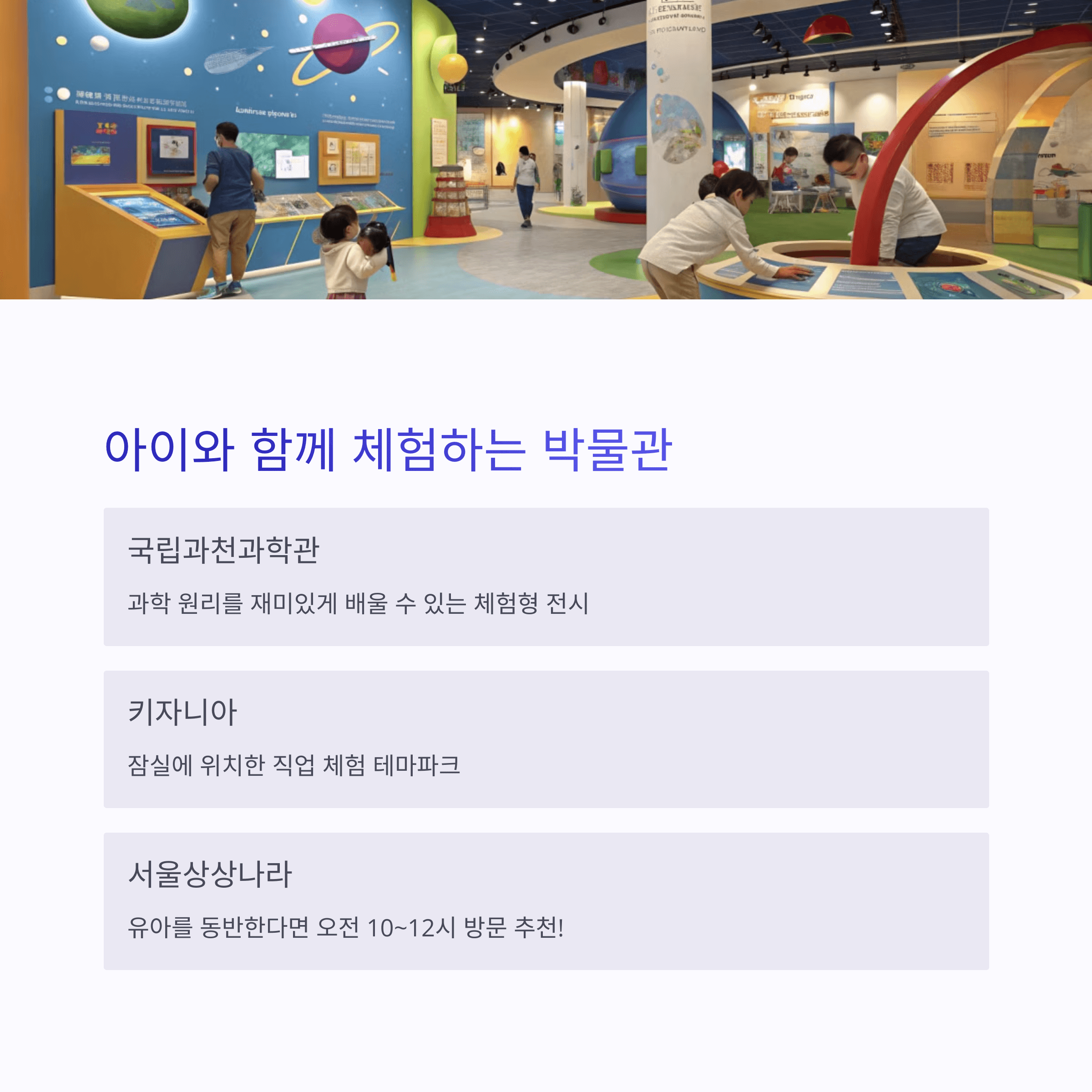 Q2. 아이와 함께 갈만한 서울 실내 공간 추천해 주세요.